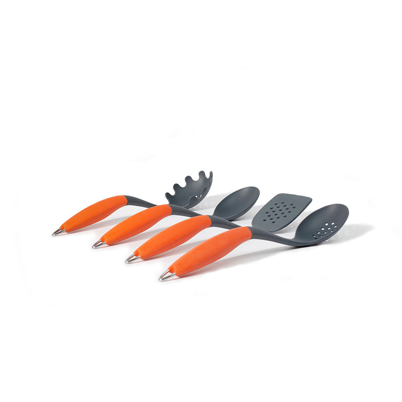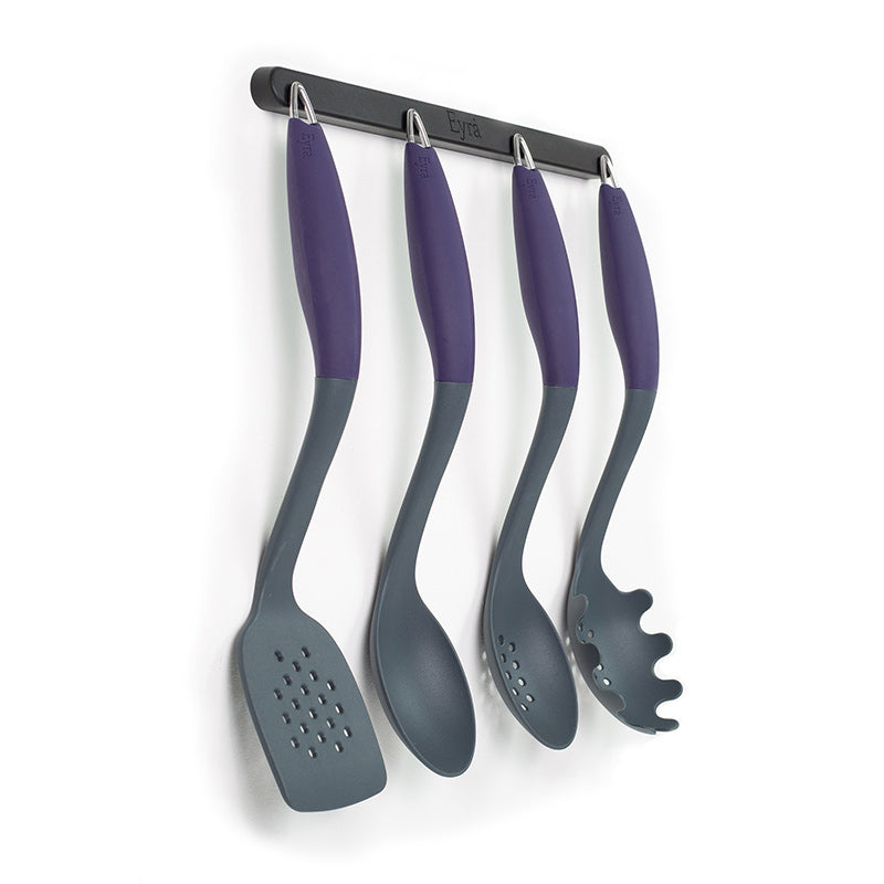 x1 pasta grabber, x1 spoon, x1 slotted spoon, x1 spatula; x1 a rack with four magnets |