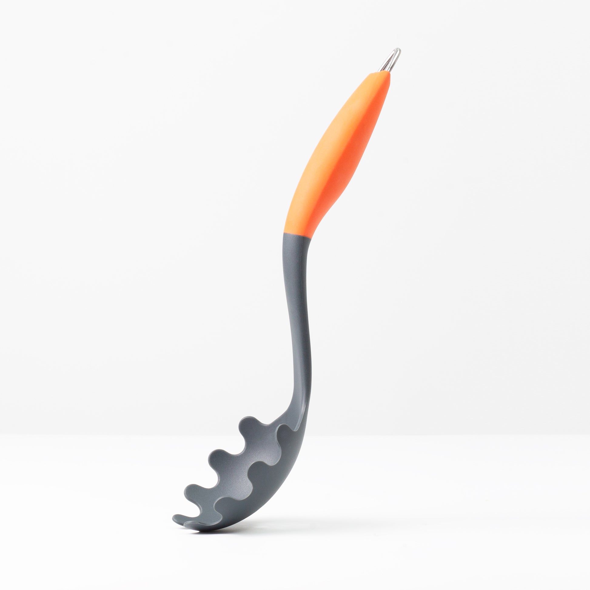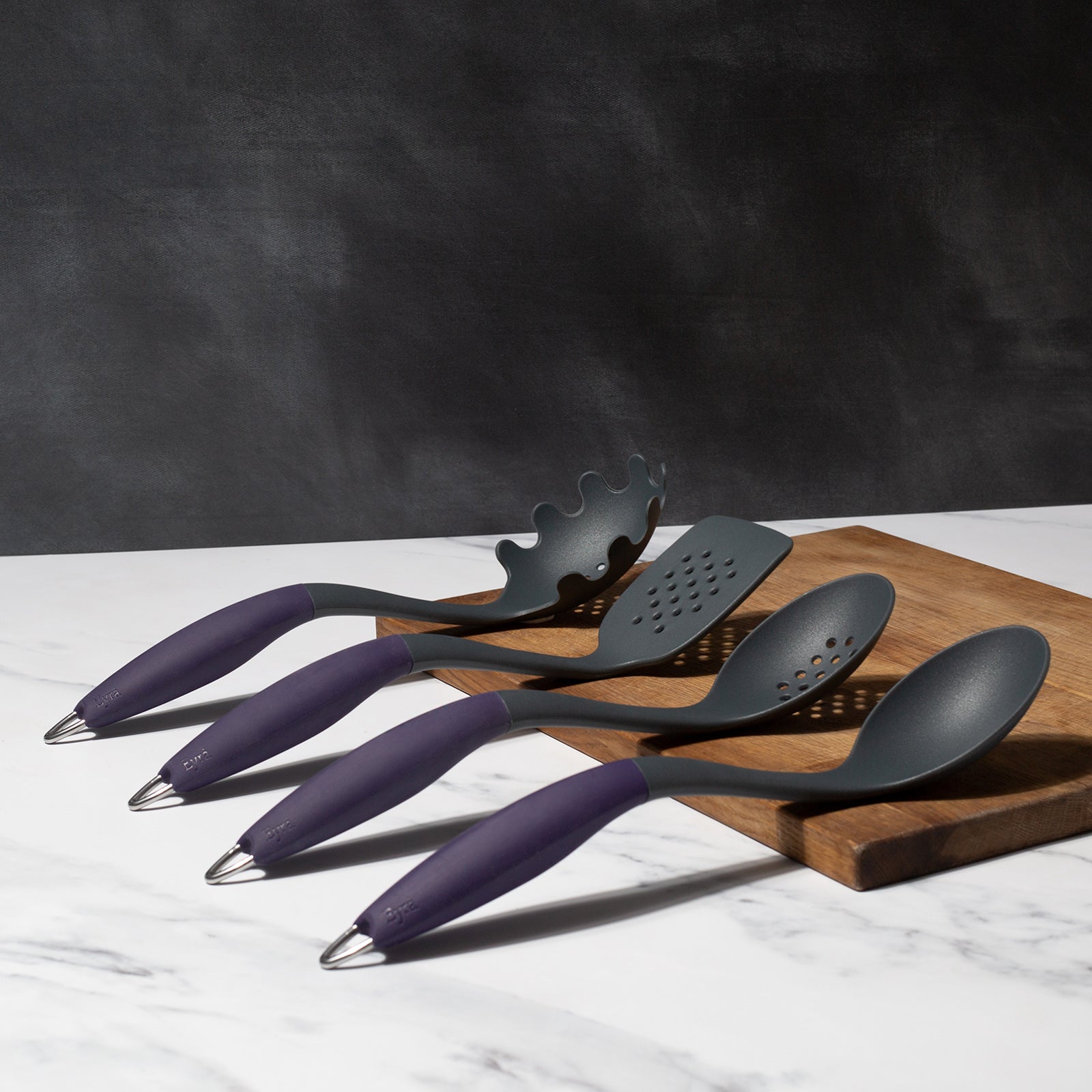 The Eyra utensils have been ergonomically designed by leading British industrial designer Sebastian Conran and are uniquely shaped. The angle of the utensils has been created to maintain a neutral wrist position and the size and shape of the handle are designed to be held with minimal grip strength. The utensils are a delight to own and use by people of all ages and abilities. The set includes a spoon, a slotted spoon, a spatula and a pasta grabber.