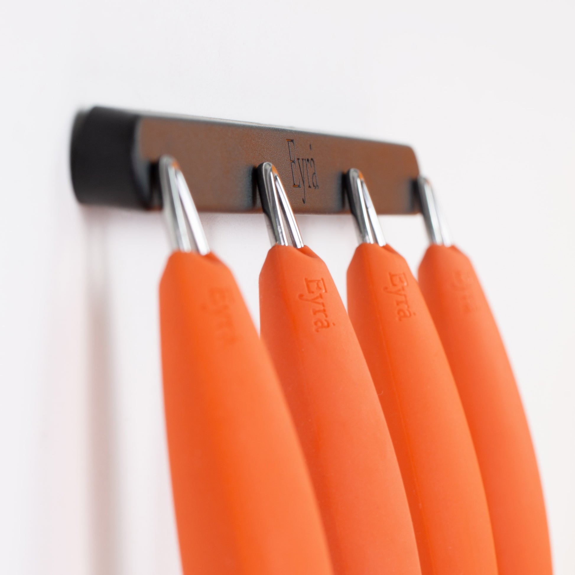 The material on the handle is over-moulded with a soft thermoplastic elastomer (TPE) so that, even when wet, they are secure in the hand with minimal grip. The tools can be attached to hooks via the loop at the end or affixed magnetically to the accompanying rack for easier, less fiddly storage.