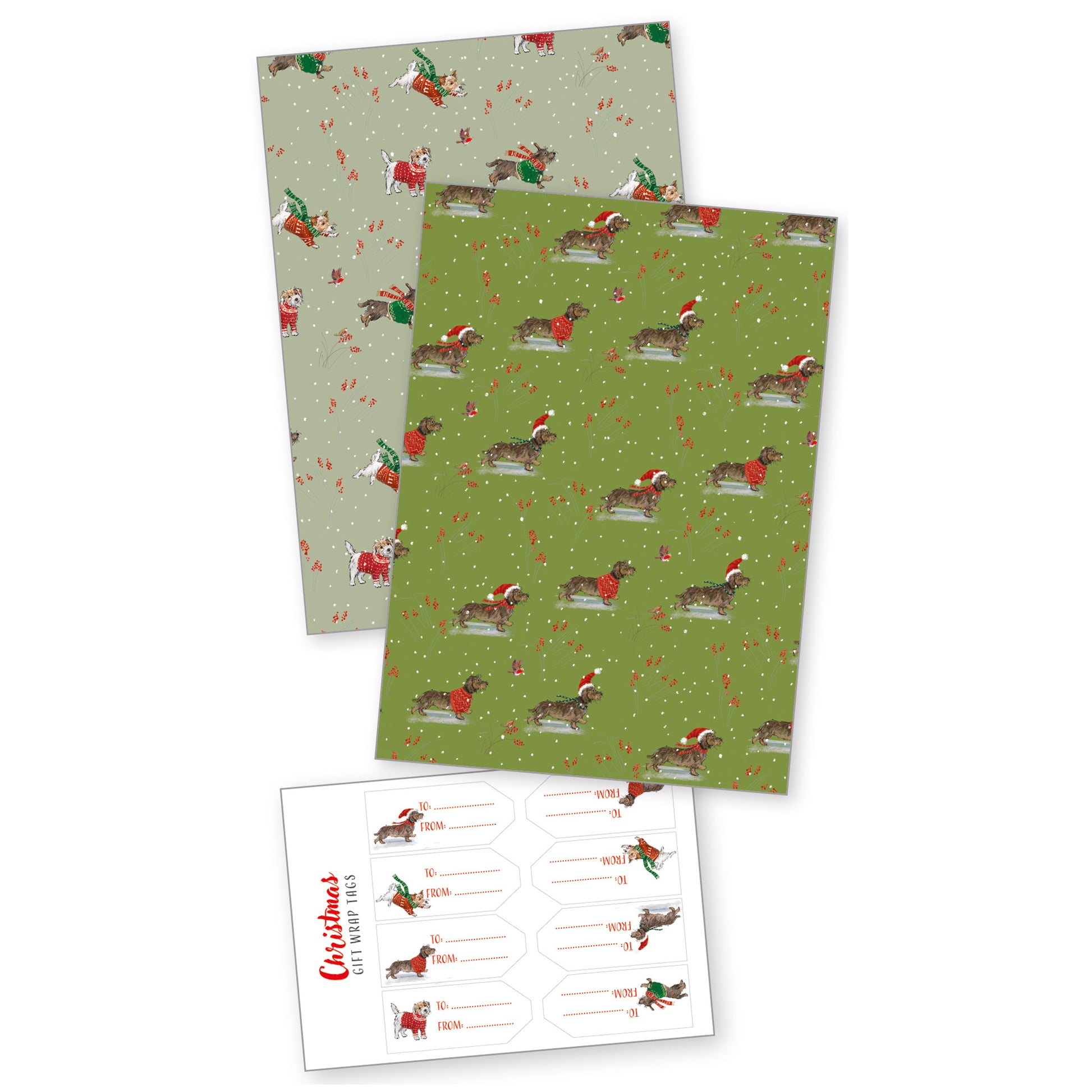 Festive Dogs - Wrapping Paper 4 Sheets, 2 designs, 8 sticker tags.