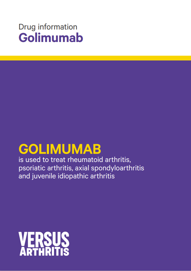 This booklet provides essential information about golimumab, a biological therapy used to treat rheumatoid arthritis, psoriatic arthritis, axial spondyloarthritis, and juvenile idiopathic arthritis by blocking TNF and reducing inflammation. It explains the conditions for which golimumab is prescribed, who can take it, and necessary tests before starting treatment. The booklet details the administration of golimumab through subcutaneous injections, potential side effects, and risks, including its impact on infections, skin cancer, and drug-induced lupus. It covers interactions with other medications, vaccination recommendations, considerations before surgery, alcohol use, and its effects on fertility, pregnancy, and breastfeeding. The booklet also includes resources for further information and support.