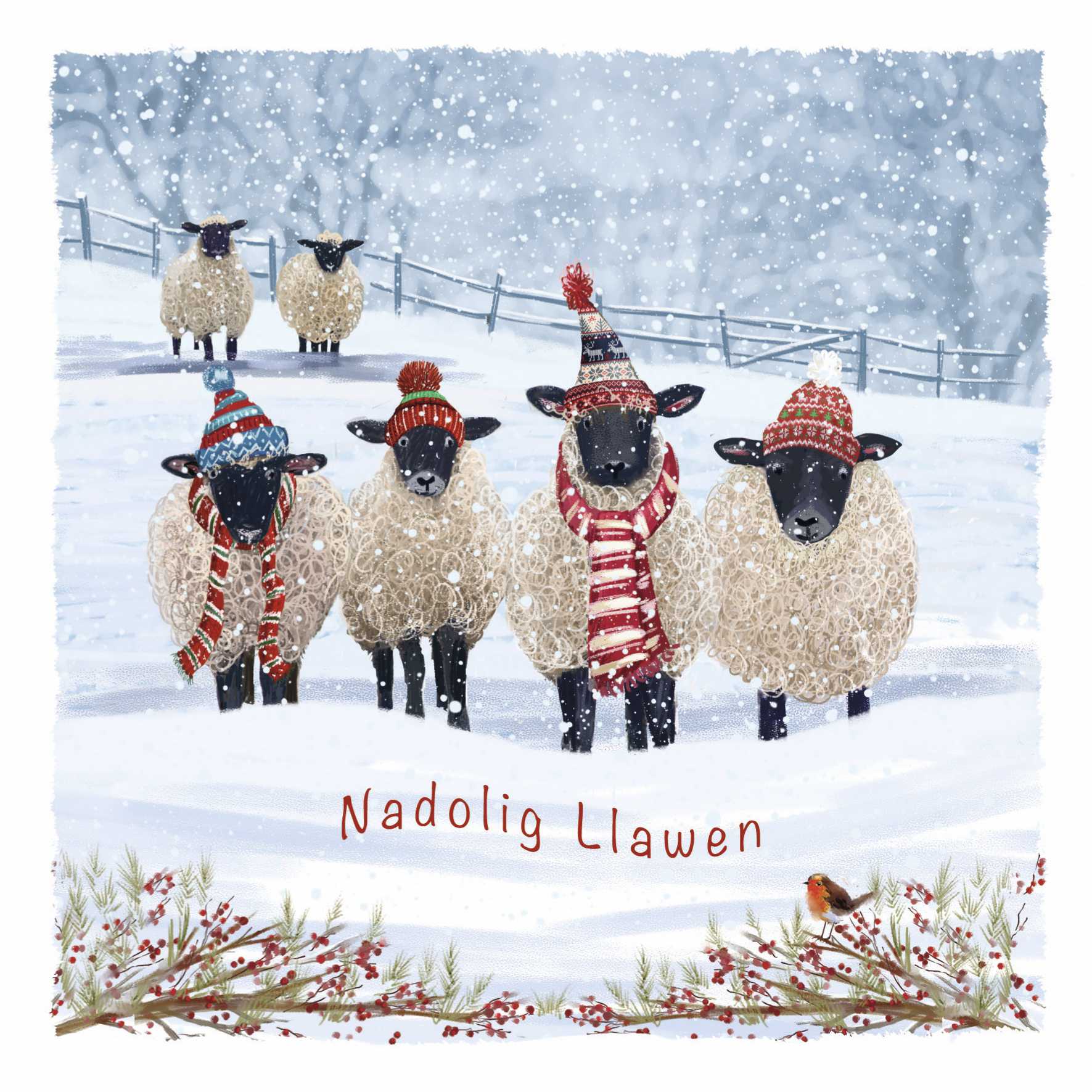 Warm Winter Woolies (Welsh) - Christmas Card (10 pack). 10 cards in a pack with white envelope.